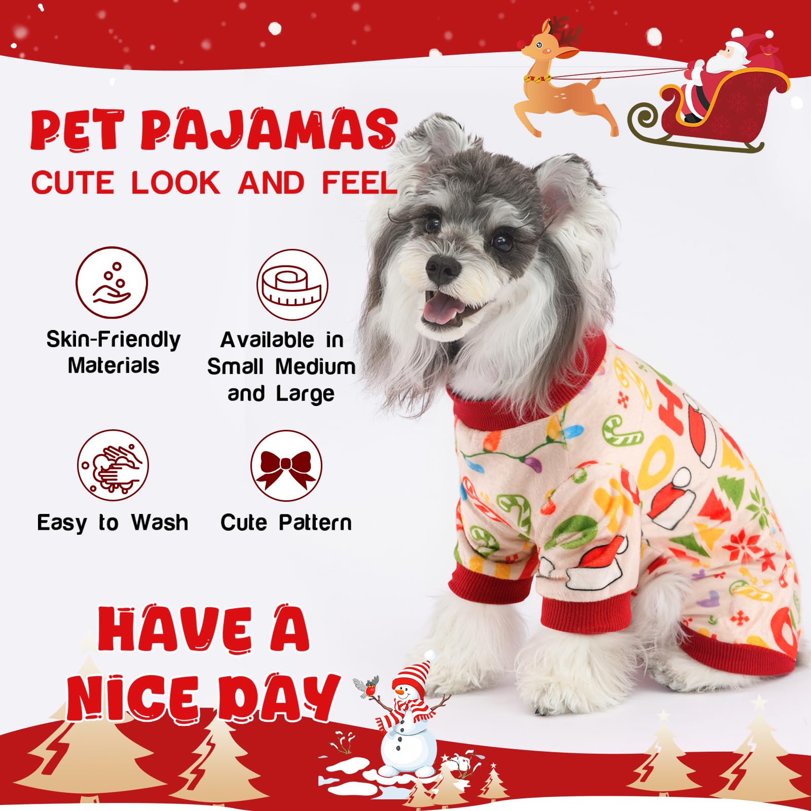 Make the holidays even more special for your furry friend with this adorable 4 Pack of Christmas Dog Pajamas! Designed for comfort, these soft and stretchy onesie-style clothes are perfect for small to medium dogs. Each pack features festive Christmas designs, including snowmen, gingerbread cookies, and Santa-themed prints. These dog pajamas are not only great for lounging at home, but they also provide warmth and a cute look for holiday photos. Easy to put on with a stretchy fabric that fits snugly and comfortably.